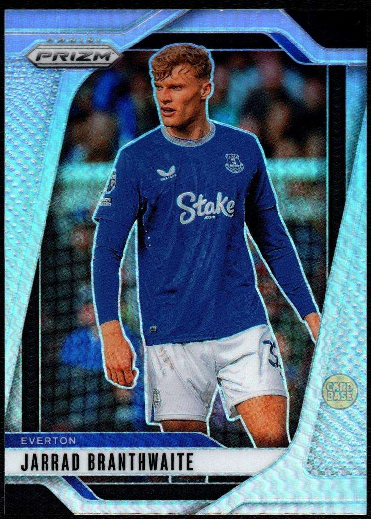 This striking Jarrad Branthwaite card showcases the Everton centre-back in a Silver parallel from the 2024-25 Panini Prizm Premier League collection. The Silver parallel delivers a distinctive metallic shimmer that creates dynamic light reflections across the card’s surface. The prizm refractor finish produces spectacular rainbow patterns that shift and dance as the card moves. Branthwaite joined Everton from Carlisle United in January 2020 for £1 million and has since established himself as a cornerstone of the Toffees’ defence.