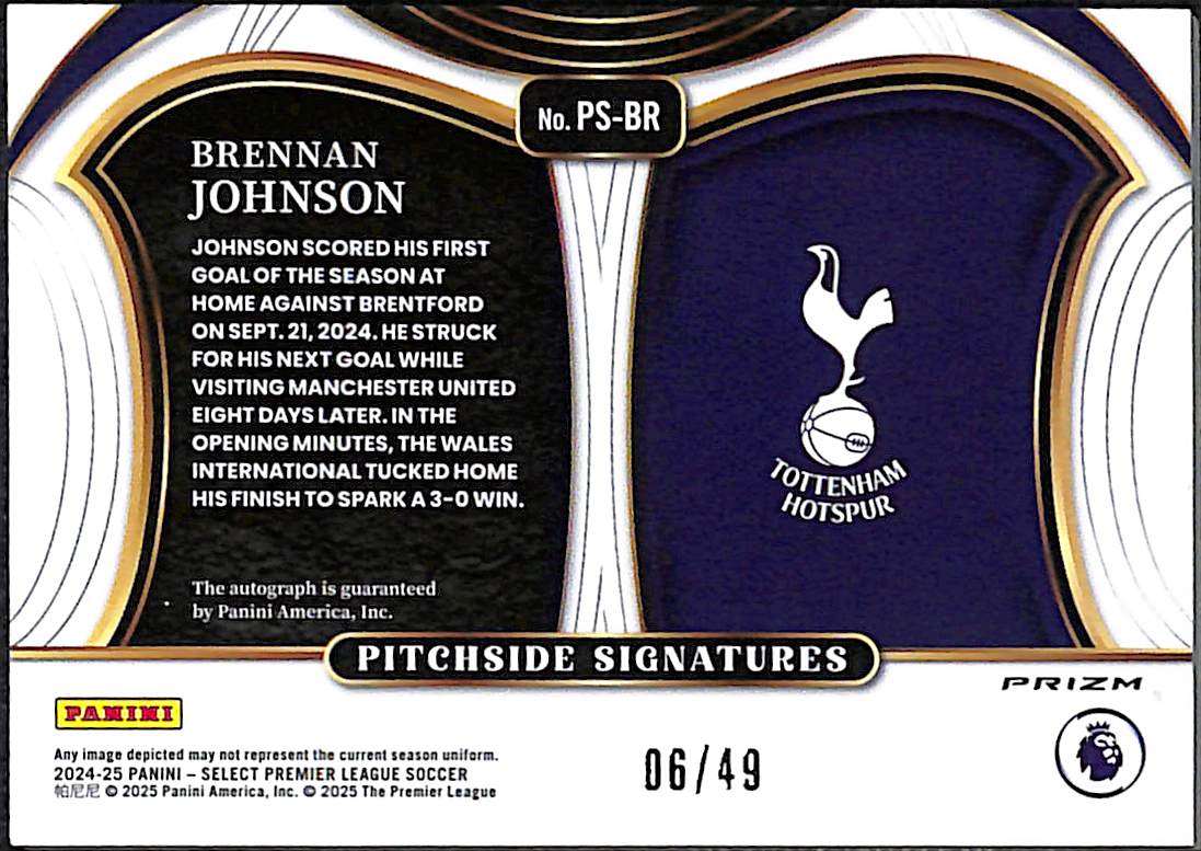 The card features Brennan Johnson in Tottenham colours, marking his first full season with the club following his transfer from Nottingham Forest in 2023. It forms part of Select’s premium autograph lineup, known for low print runs and high-quality presentation.