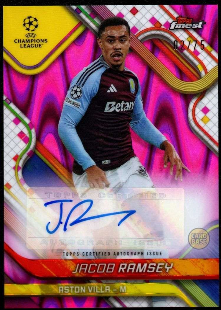 This Jacob Ramsey Topps Finest card is card number BA-RA from the 2024-25 Topps Finest Premier League collection. It is a numbered parallel, with this specific card serial numbered 2/75, making it one of just 75 copies produced worldwide. The card features Topps Finest’s premium chromium finish with sharp action photography and bright colour detailing. Ramsey is a product of Aston Villa’s academy and has developed into one of the most dynamic midfielders in the league.