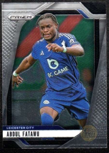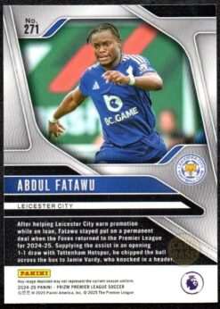 Official Abdul Fatawu base card from the 2024-25 Panini Prizm Premier League collection. The card displays the Ghanaian winger in Leicester City’s blue kit. Card number 271 captures the pacey young talent who joined from Sporting CP.