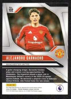 Official Alejandro Garnacho base card from the 2024–25 Panini Prizm Premier League collection. Features the Argentine midfielder in Manchester United’s red kit. Card number 132 showcases the exciting young winger who has become a fan favorite with his direct running and ability to produce moments of magic.
