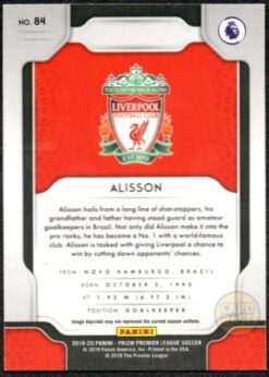 Alisson Liverpool FC football card from the 2019-20 Panini Prizm Premier League set. Base card #84 features the Brazilian goalkeeper. Standard chromium finish with prismatic technology.