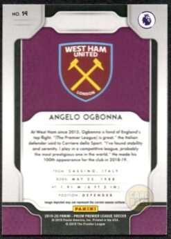 Angelo Ogbonna West Ham United football card from the 2019-20 Panini Prizm Premier League. Card #14 shows the Italian defender. Chromium finish with prismatic technology.