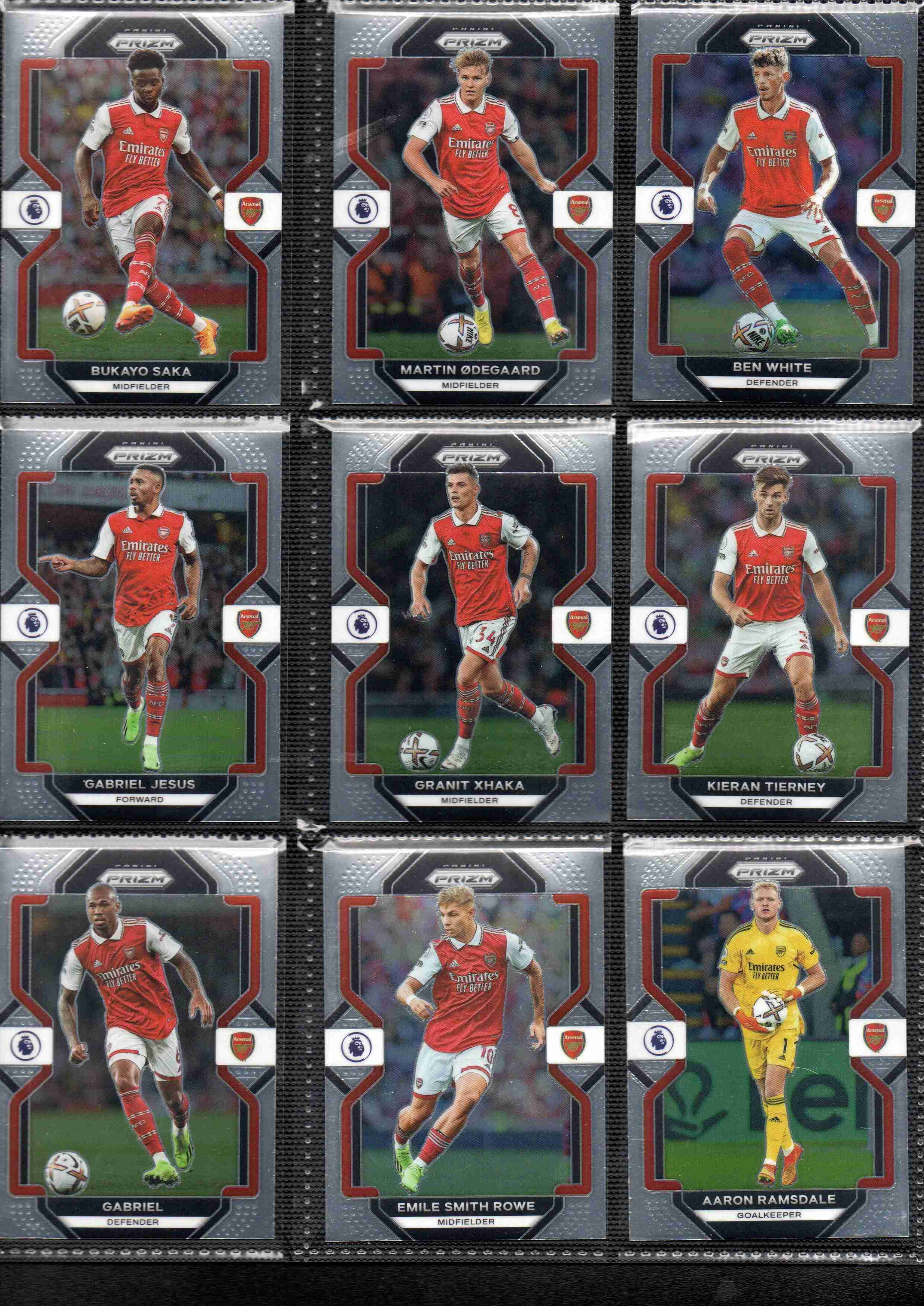 Complete Arsenal base card team set from the 2022–23 Panini Prizm Premier League collection.
