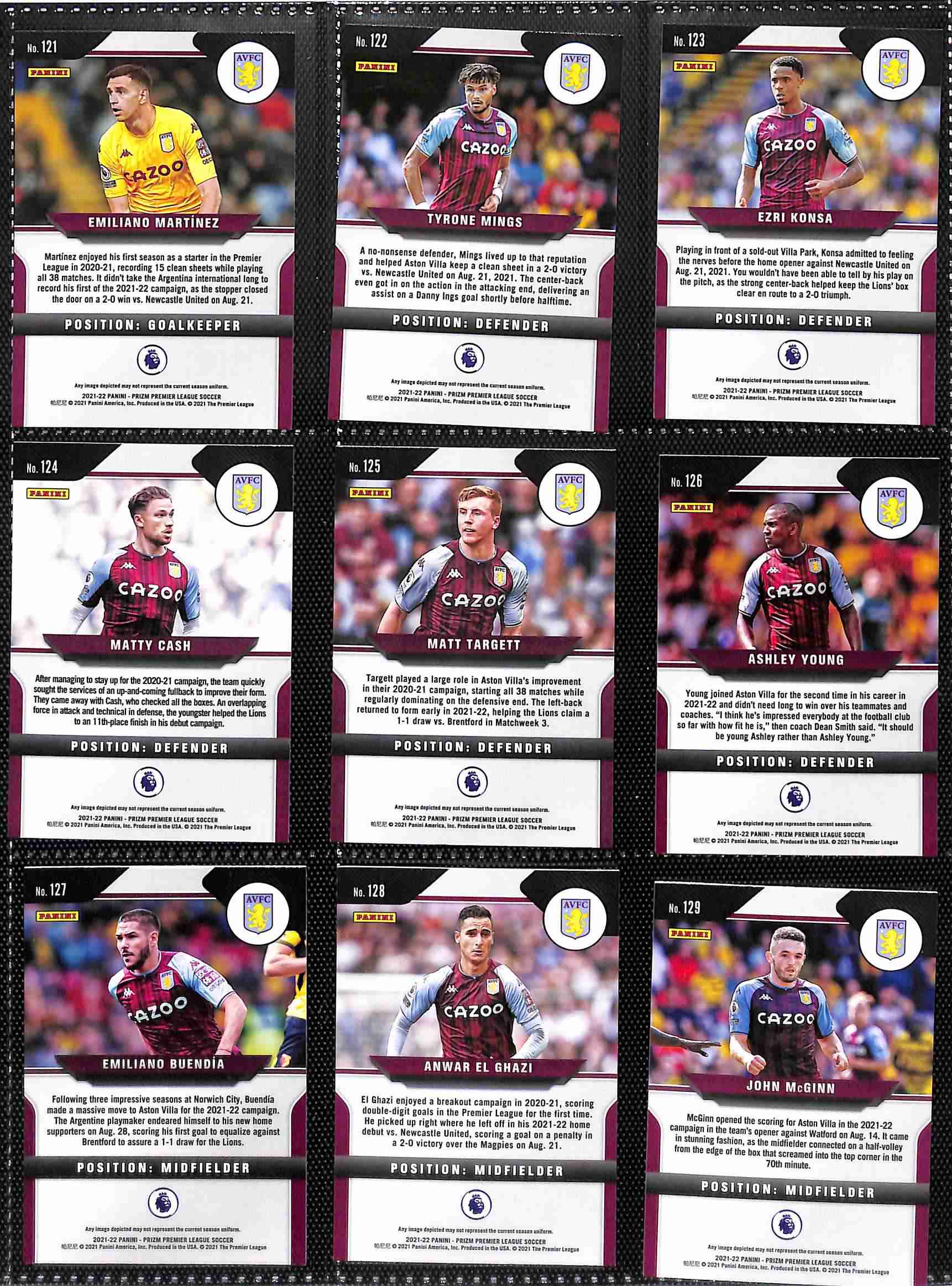 This complete set features all 15 Aston Villa players included in the 2021–22 Panini Prizm release: