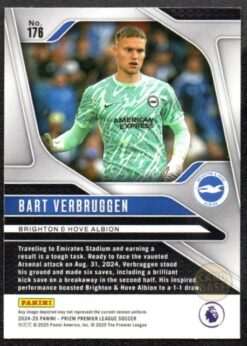 Official Bart Verbruggen base card from the 2024-25 Panini Prizm Premier League collection. This card features the Dutch goalkeeper in Brighton’s blue and white kit. Card number 176 showcases the young shot-stopper who arrived at the Amex Stadium from Anderlecht.