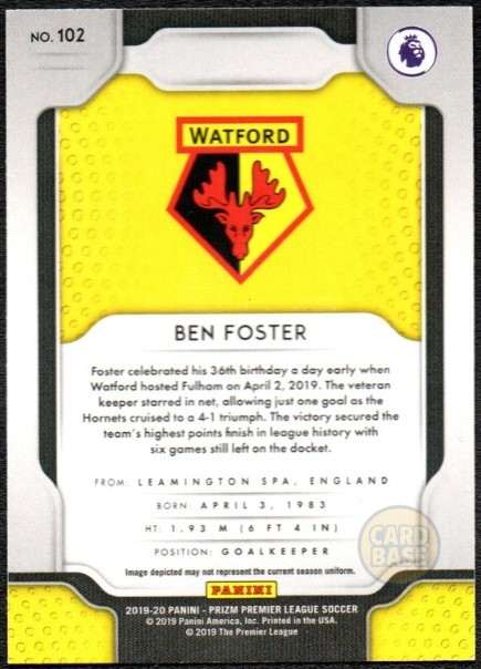 Ben Foster Watford football card from the 2019-20 Panini Prizm Premier League set. Base card #102 features the English goalkeeper. Standard chromium finish with prismatic technology.
