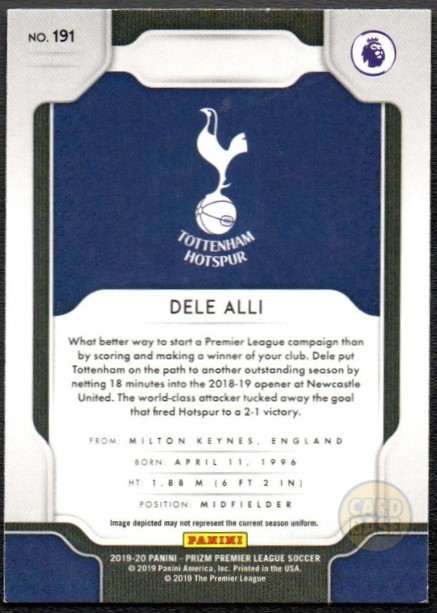 Dele Alli Tottenham Hotspur football card from the 2019-20 Panini Prizm Premier League collection. Base card #191 from the set shows the English midfielder. Prismatic chromium finish.