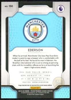 Ederson Manchester City football card from the 2019-20 Panini Prizm Premier League set. Base card #150 features the Brazilian goalkeeper. Standard chromium finish with prismatic technology.
