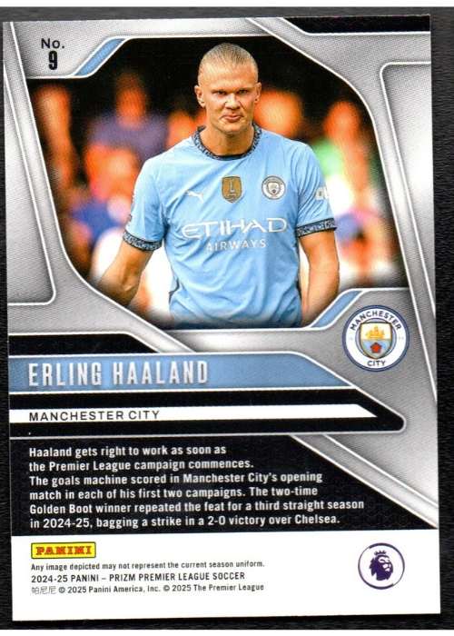 Official Erling Haaland base card from the 2024-25 Panini Prizm Premier League collection. This card features the Norwegian striker in Manchester City’s sky blue kit. Card number 9 showcases the phenomenal goalscorer who has redefined attacking standards through his devastating combination of pace, power and clinical finishing.