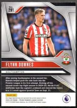 Official Flynn Downes base card from the 2024-25 Panini Prizm Premier League collection. The card displays the English midfielder in Southampton’s red and white kit. Card number 291 captures the combative midfielder who provides energy and defensive stability.