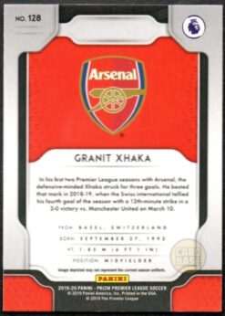 Official Granit Xhaka base card from the 2019-20 Panini Prizm Premier League collection. This release marked Panini’s first year producing Prizm for the Premier League, making it a key set in modern football collecting. Card number 128 features Granit Xhaka as part of Arsenal’s squad for the 2019-20 season.