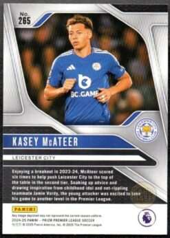 Official Kasey McAteer base card from the 2024-25 Panini Prizm Premier League collection. The card displays the Northern Irish midfielder in Leicester City’s blue kit. Card number 265 captures the versatile player who has come through the Foxes’ academy system.