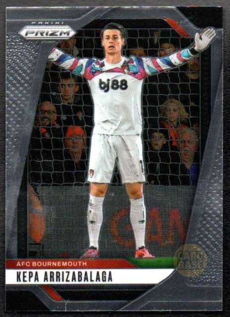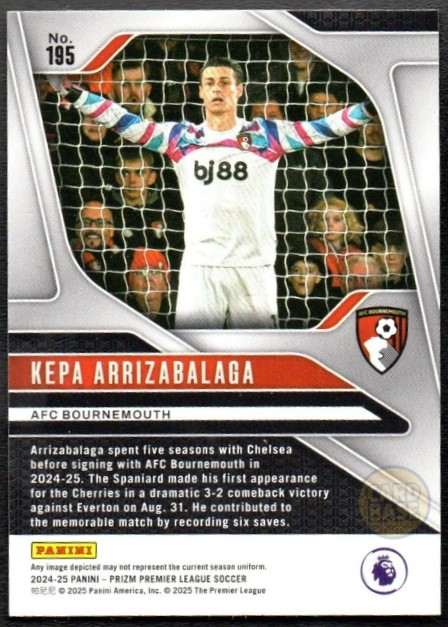 Official Kepa Arrizabalaga base card from the 2024-25 Panini Prizm Premier League collection. This card features the Spanish goalkeeper in Bournemouth’s home kit. Card number 195 showcases the experienced shot-stopper who joined the Cherries on loan from Chelsea.