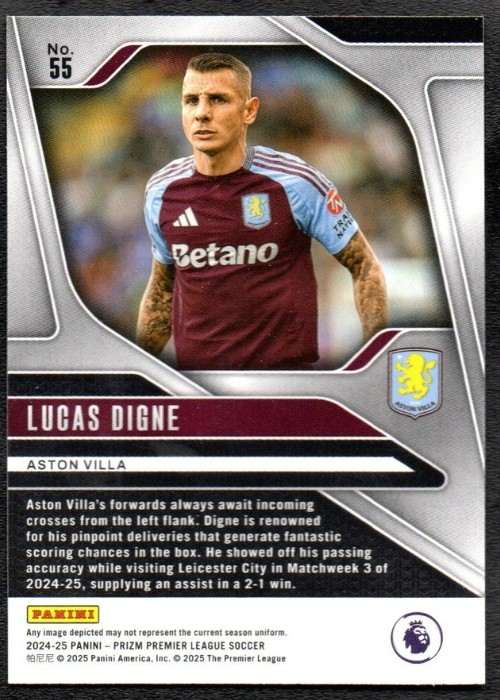Official Lucas Digne base card from the 2024-25 Panini Prizm Premier League collection. This card features the French left-back in Aston Villa’s claret and blue kit. Card number 55 showcases the experienced defender whose set-piece expertise and crossing ability provide consistent attacking threat from the left flank.