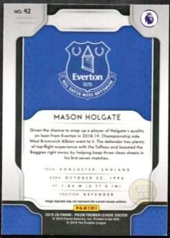 Mason Holgate Everton football card from the 2019-20 Panini Prizm Premier League collection. Base card #42 from the Premier League set showcases the English defender in chromium finish. The prismatic surface technology delivers the rainbow refractions standard on Prizm cards.