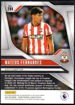 Official Mateus Fernandes base card from the 2024-25 Panini Prizm Premier League collection. The card displays the Portuguese midfielder in Southampton’s red and white kit. Card number 294 captures the creative midfielder who brings technical quality to the Saints.