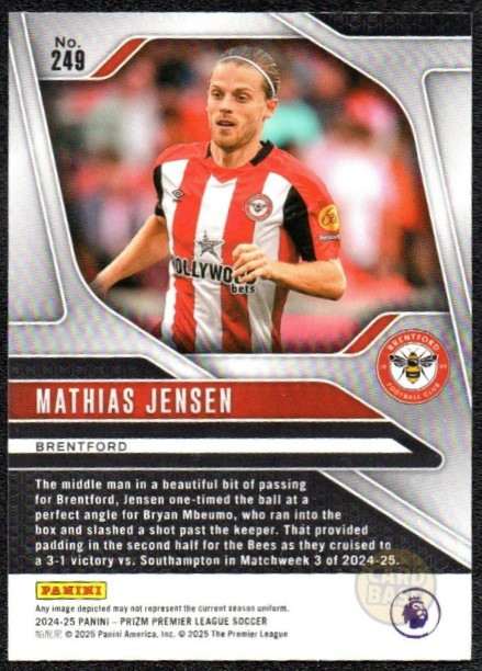 Official Mathias Jensen base card from the 2024-25 Panini Prizm Premier League collection. The card displays the Danish midfielder in Brentford’s red and white stripes. Card number 249 captures the creative playmaker who provides technical ability in the Bees’ midfield.