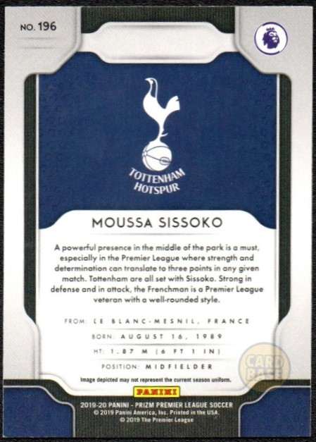 Moussa Sissoko Tottenham Hotspur football card from the 2019-20 Panini Prizm Premier League. Card #196 shows the French midfielder. Chromium finish with prismatic technology.