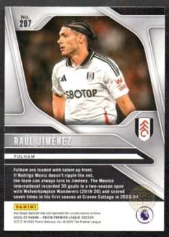 Official Raul Jimenez base card from the 2024-25 Panini Prizm Premier League collection. The card displays the Mexican striker in Fulham’s white kit. Card number 207 captures the experienced forward who joined from Wolverhampton Wanderers.