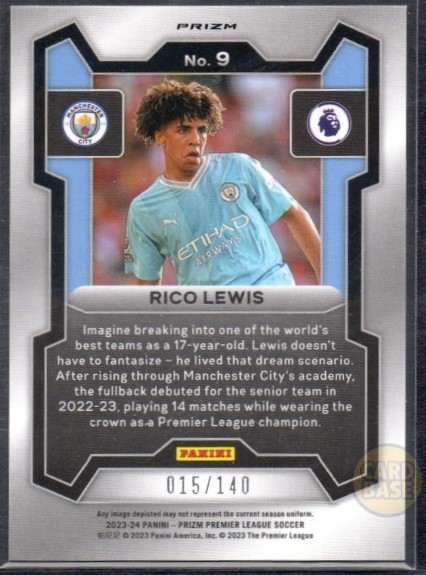 Manchester City defender Rico Lewis base card from 2024-25 Panini Prizm collection