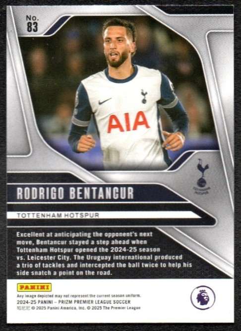 Official Rodrigo Bentancur base card from the 2024-25 Panini Prizm Premier League collection. This card features the Uruguayan midfielder in Tottenham’s white kit. Card number 83 showcases the industrious midfielder whose defensive intelligence and distribution have become vital to Spurs’ midfield balance.