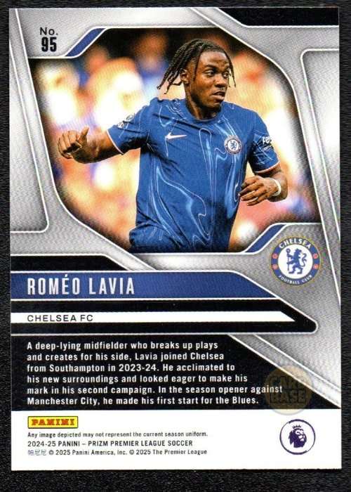 Official Romeo Lavia base card from the 2024-25 Panini Prizm Premier League collection. This card features the Belgian midfielder in Chelsea’s blue kit. Card number 95 showcases the defensive midfielder who arrived at Stamford Bridge from Southampton.