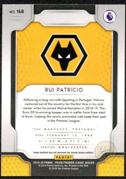 Rui Patricio Wolverhampton Wanderers football card from the 2019-20 Panini Prizm Premier League set. Base card #168 features the Portuguese goalkeeper. Standard chromium finish with prismatic technology.