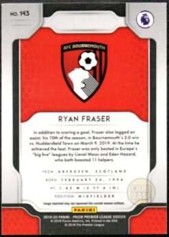 Official Ryan Fraser base card from the 2019-20 Panini Prizm Premier League collection. This release marked Panini’s first year producing Prizm for the Premier League, making it a key set in modern football collecting. Card number 143 features Ryan Fraser as part of AFC Bournemouth’s squad for the 2019-20 season.
