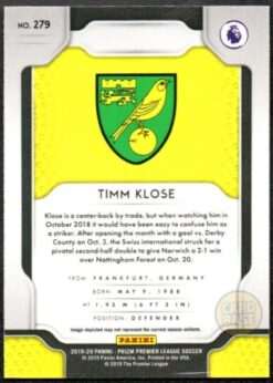 Timm Klose Norwich City football card from the 2019-20 Panini Prizm Premier League. Base card #279 features the Swiss defender. Chromium finish with prismatic surface.
