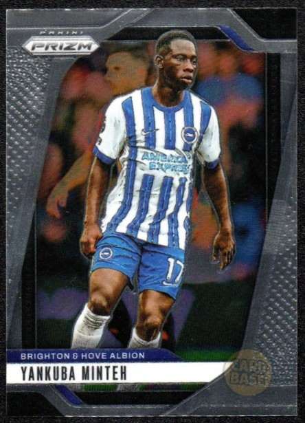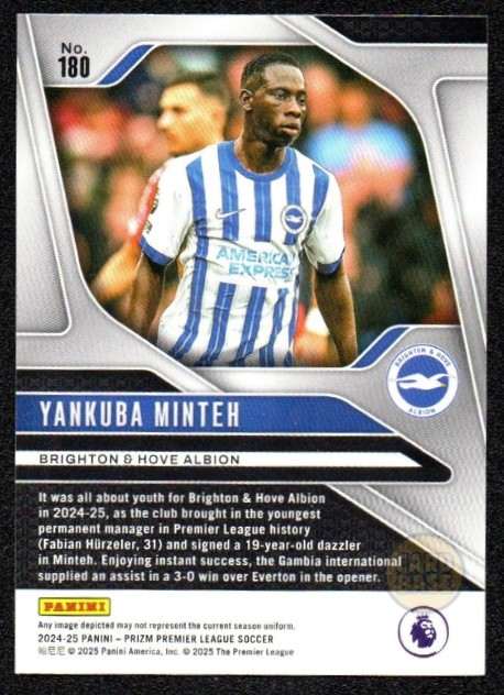 Official Yankuba Minteh base card from the 2024-25 Panini Prizm Premier League collection. This card features the Gambian winger in Brighton’s blue and white stripes. Card number 180 showcases the pacey young talent who arrived at the Amex Stadium from Newcastle United.
