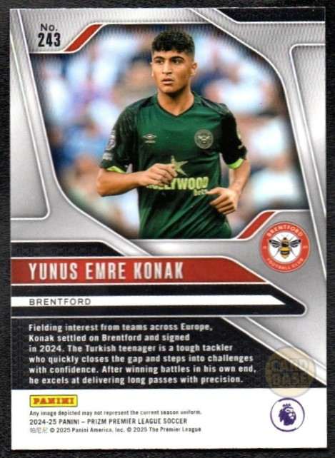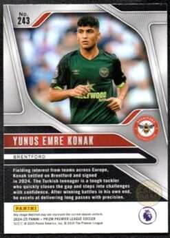 Official Yunus Emre Konak base card from the 2024-25 Panini Prizm Premier League collection. The card displays the Turkish midfielder in Brentford’s red and white stripes. Card number 243 captures the young talent who represents the future of the Bees’ midfield.